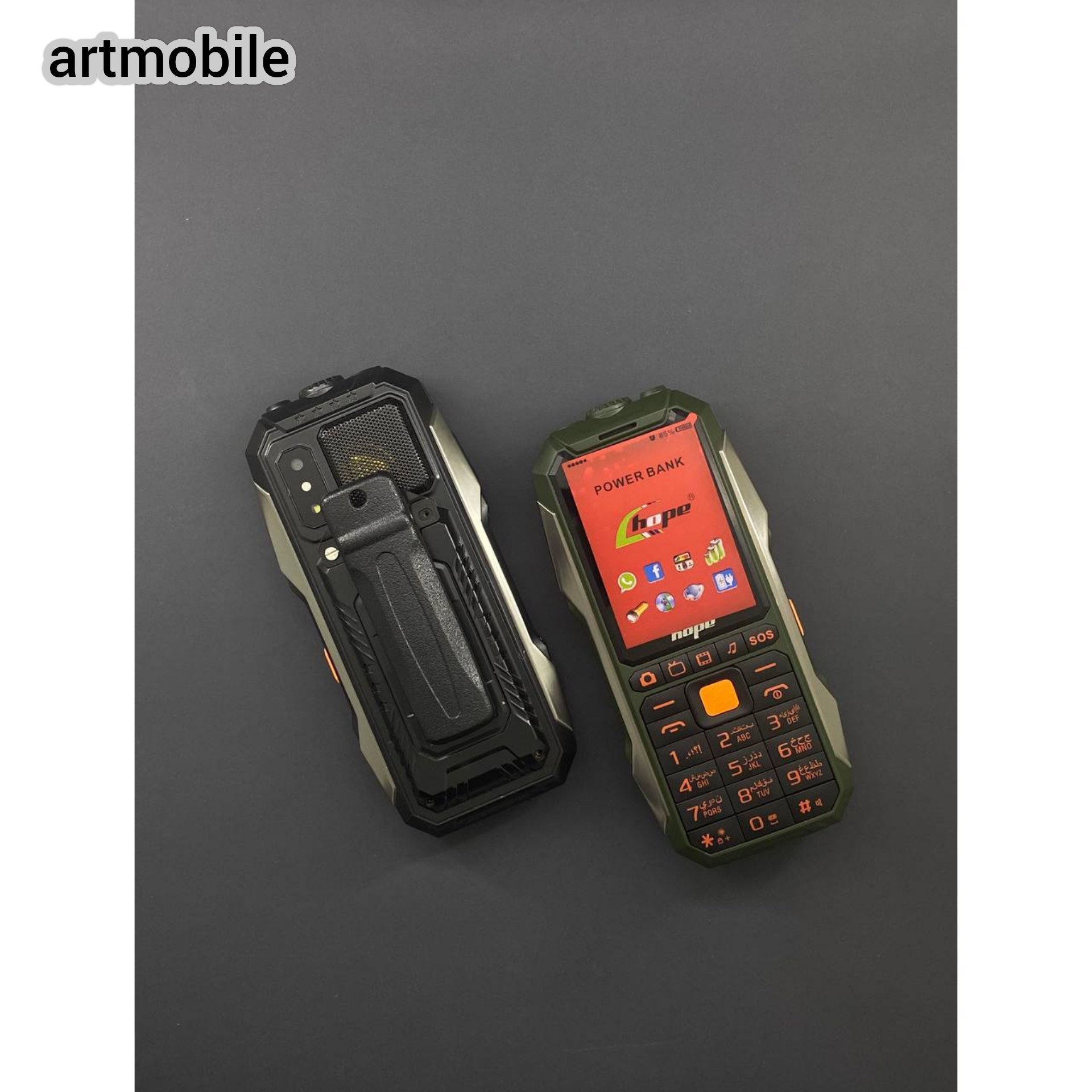 دارای بدنه ی مقاوم و ضد ضربه،دارای چراغ قوه ی قدرتمند پروژکتوری،صفحه کلید کلاسیک ،قابلیت باتری در نقش پاوربانک(فقط برای شارژ های جزئی و ضروری)
