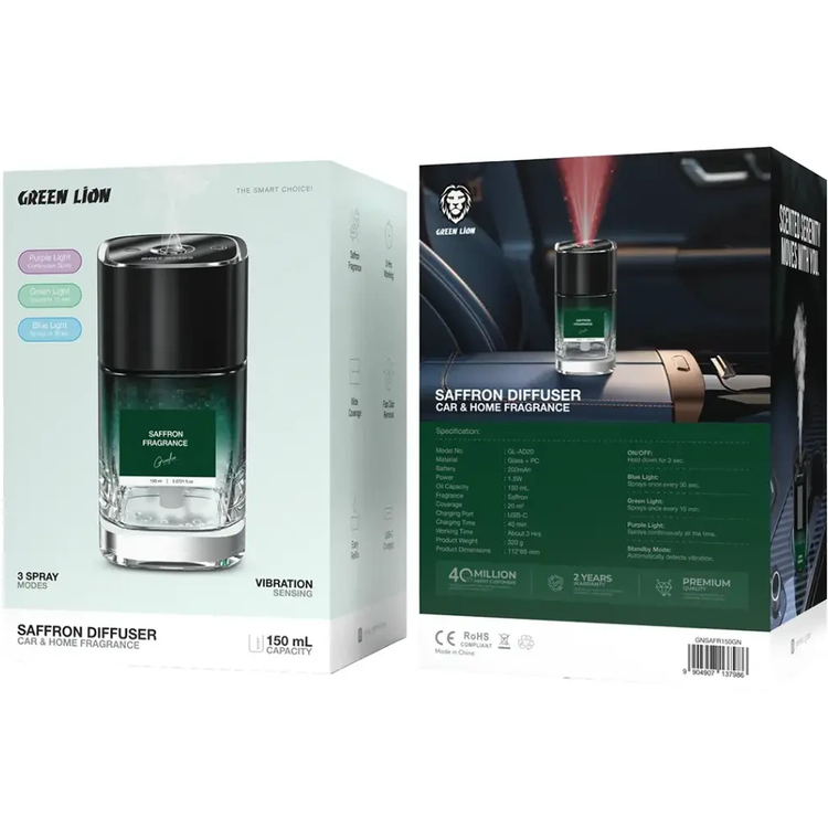 •Working Time: About 3 hrs •Material: Glass + PC •Battery: 200mAh •Oil Capacity: 150 mL •Fragrance: Saffron •Charging Port: USB - C •Charging Time: 4 0 min •Saffron Fragrance •Coverage: 20 m² •Fast Odor Removal •Wide Coverage •Easy Refills •Power: 1.5W